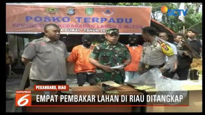 Seperti ditayangkan Liputan6 SCTV, Jumat (1/3/2019), keempat tersangka pembakar lahan masing-masing berinisial S, SM, P dan M. Mereka diringkus di lokasi kebakaran, tepatnya di Meranti Laut, Kota Dumai, Riau.