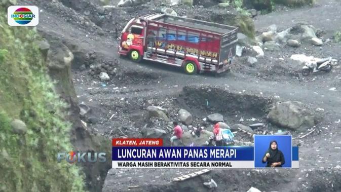 Seperti ditayangkan Fokus Indosiar, Minggu (3/3/2019), aktivitas warga di kawasan lereng Gunung Merapi, di Desa Balerante, Klaten, Minggu pagi tetap normal. Warga juga tetap melakukan penambangan pasir di alur Kaliworo.