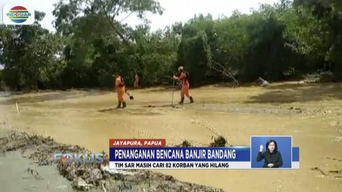 Fokus, Papua - Jelang tenggat waktu masa tanggap darurat, tim SAR gabungan bekerja keras untuk tetap melakukan pencarian terhadap 82 korban banjir bandang di Jayapura, Papua, yang masih hilang. Sementara itu, situasi di jalur utama Kota Sentani sudah normal.