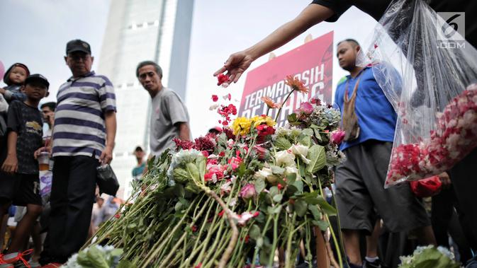 Anggota TKN Milenial Jokowi-Ma'ruf membagikan bunga kepada pengunjung car free day dalam kegiatan tabur bunga di Bundaran HI, Jakarta, Minggu (28/4/2019). Mereka mengajak masyarakat untuk ikut mengungkapkan duka atas meninggalnya 272 petugas KPPS dalam Pemilu 2019. (Liputan6.com/Faizal Fanani)