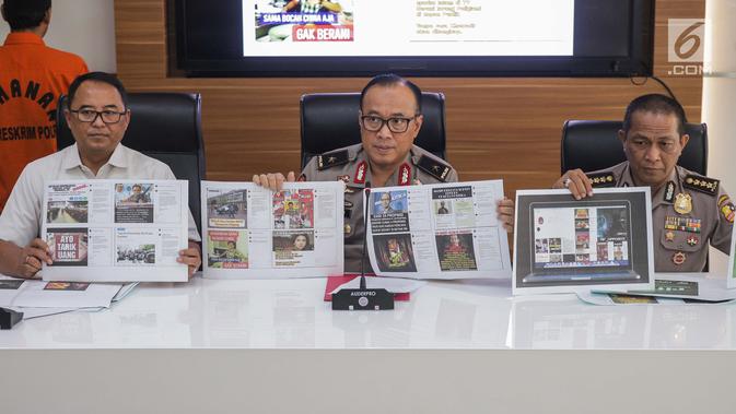 Karopenmas Divisi Humas Polri Brigjen Pol Dedi Prasetyo (tengah) dan Kasubdit I Dittipidsiber Bareskrim Polri Kombes Pol Dani Kustoni (kiri) memberikan keterangan pers saat rilis kasus pemberitaan hoax di Divhumas Mabes Polri, Jakarta, Senin (1/7/2019). (Liputan6.com/Faizal Fanani)