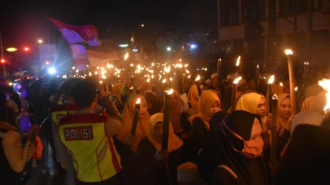 Liputan6.com, Jakarta - Ribuan umat muslim di Bogor, Jawa Barat turun ke jalan untuk menyambut Tahun Baru Islam pada 1 Muharam 1441 Hijriah yang bertepatan dengan 1 September 2019. Tidak hanya remaja dan anak-anak, orang tua pun tak mau ketinggalan membawa obor kemudian berkeliling menyinari sudut Kota dan Kabupaten Bogor.