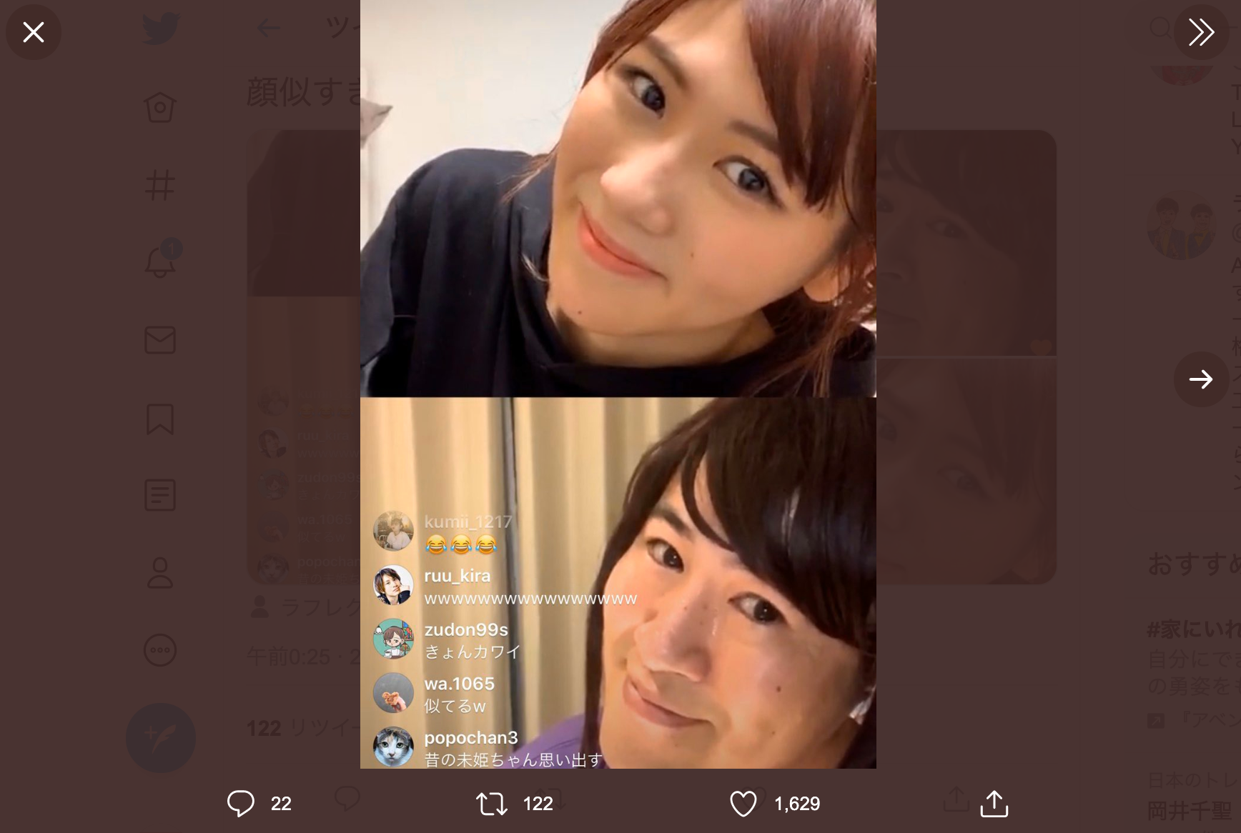 これについてファンからは「めっちゃ似てる」「そっくりさんで番組出てほしいw」「まさかコラボする日が来るとは! 表情といいパーツと言い、妙に似てますよね(笑)」「1年くらい前から似てるなぁ〜って思ってました」「似すぎてます」と、“似てる” といった声が多くあがり、ネットで大きな反響を呼んでいる。なお、きょん本人も西野の投稿に「妹よ。また会おう!」とコメントしており、本人同士もお互いが似ていると自覚しているようだ。