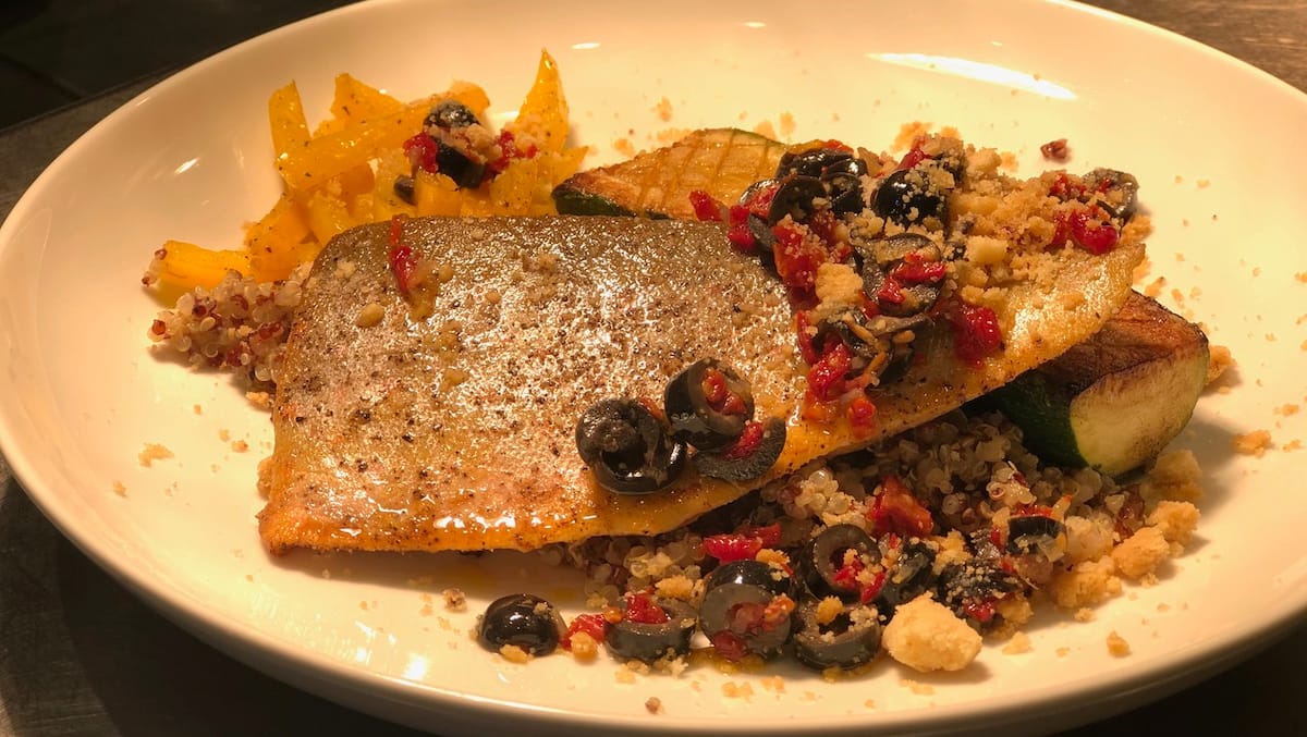 Omble chevalier, légumes grillés, crumble à l'ail et sauce vierge à l'échalote, tomates séchées et olives - Salut Bonjour