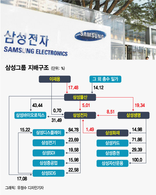 삼성그룹의 지배구조는 '이재용 삼성전자 부회장→삼성물산→삼성생명→삼성전자'로 이뤄진다. 이 부회장이 삼성물산 지분(17.48%)을 지렛대로 삼성전자 경영권을 확보하는 구조다. 삼성물산이 보유한 삼성전자 지분(5.01%)과 삼성생명이 보유한 삼성전자 지분(8.51%)이 이 부회장과 삼성전자를 연결하는 핵심고리다.