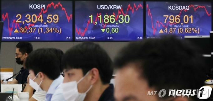 | (서울=뉴스1) 민경석 기자 = 21일 서울 중구 명동 하나은행 딜링룸 전광판에 코스피 지수가 전일 대비 30.37포인트(1.34%) 상승한 2,304.59를, 원·달러환율은 0.60원 상승한 1,186.30원을, 코스닥 지수는 4.87포인트(0.62%) 상승한 796.01을 나타내고 있다. 2020.8.21/뉴스1 |