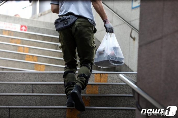 | (서울=뉴스1) 황기선 기자 = 신종 코로나 바이러스 감염증(코로나19)의 여파로 사회적 거리두기 2단계가 진행되고 있는 가운데 15일 서울 시청역에서 배달원이 도시락을 들고 이동하고 있다. 2020.9.15/뉴스1 |